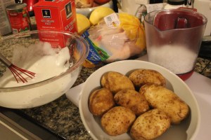 So here we’ve got a dish full of potatoes, four egg whites whipped to stiff peaks (much like a gay S&M club) and a pound of rock salt.