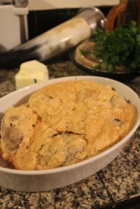 Basically this was a low-stress, delicious way to do potatoes. They were moist and fluffy and cooked all the way through. They broke up nicely and soaked up the sauce Basquaise. The added bonus that you can do-ahead and keep them warm and fresh in the crust is another point in their favor. Whipping egg whites isn’t my favorite thing in the world, but it didn’t take that long. And anyway I’ve been working out a lot lately, and am becoming thoroughly mighty – so much so that no egg white stands a chance against my mighty thews. Thews are important for a chef, right Tony?