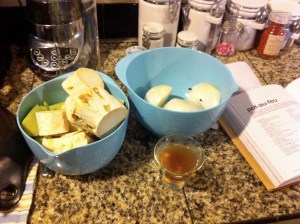 I covered it in cold water, and brought that to a boil. While it was heating up, I got the rest of my meez in place – as well as having a cocktail I invented called a “caramel apple kick-in-the-head”.