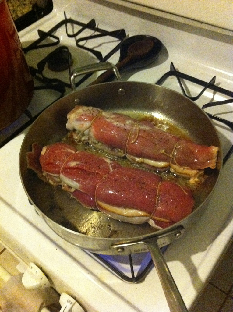 First I confited some garlic – super easy, though I’ve never actually done it before. I certainly will again. Then I flattened the tenderloins as instructed, and lined them with bacon and garlic confit. I trussed those suckers up like.. well, trussed pigs. I wonder if the pigs the tenderloins came from were ever trussed? If so, that would be a weird bit of fate dovetailing itself on my cutting board, don’t you think? I wrapped ’em up and threw them in the fridge till the next day.