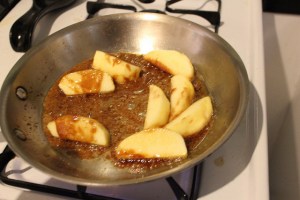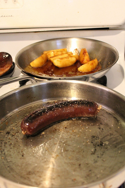 All that remained was to coat the apples in the caramel, and the blacken the sausage in a pan before putting everything in the oven.