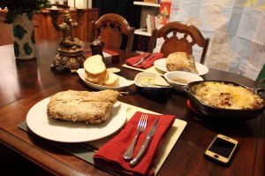 Whipping up the sauce from the searing pan was easy while they cooked. I’ve noticed in general that your recipes in the book take about 1/3 again as long as you say they ought. I theorize that my oven just isn’t as hot as a professional oven. (That is also not a euphemism.) Anyway they came out more than just a little raw, but having seen this before throughout this project, I knew to leave the oven hot just in case. A few extra minutes did the trick, and they were perfect.