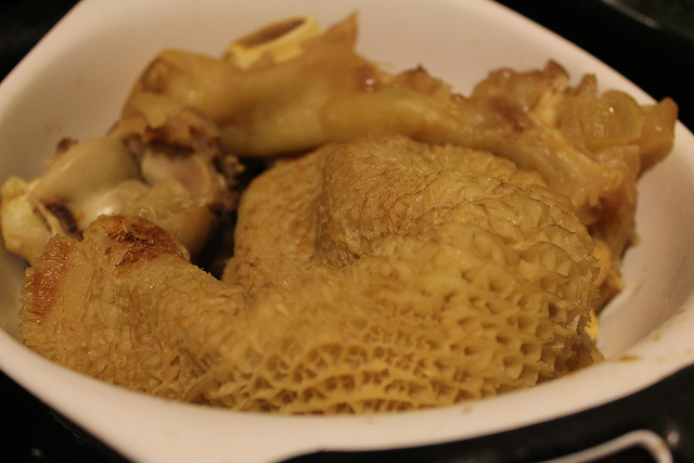 I’ve tried to come up with the words to express the smell of simmering tripe – both kinds, feathered and honeycomb – but ..it’s tough. “Boiled ass?” “Hot fuckall?” “Stewed garbage?” I just don’t know. But it’s not good, and it’s relentless. The pig’s ears and calves’ hooves weren’t so bad – really sort of typical porky smell, which is not half bad at all.