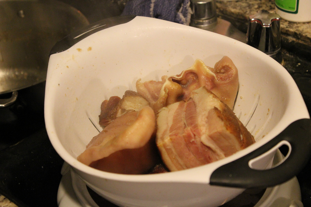 But that tripe? Good lord. You hinted obliquely that it would smell better after the first awful step. What you didn’t mention was how it would seep into every crack and corner of the house. It wasn’t that it smelled super awful, but it did smell pretty bad, and you just couldn’t shake it. Anyway, I simmered the tripe and an unpeeled, halved onion for three hours and drained it. I also simmered the pork belly, pig’s ears and hooves for two and a half hours.