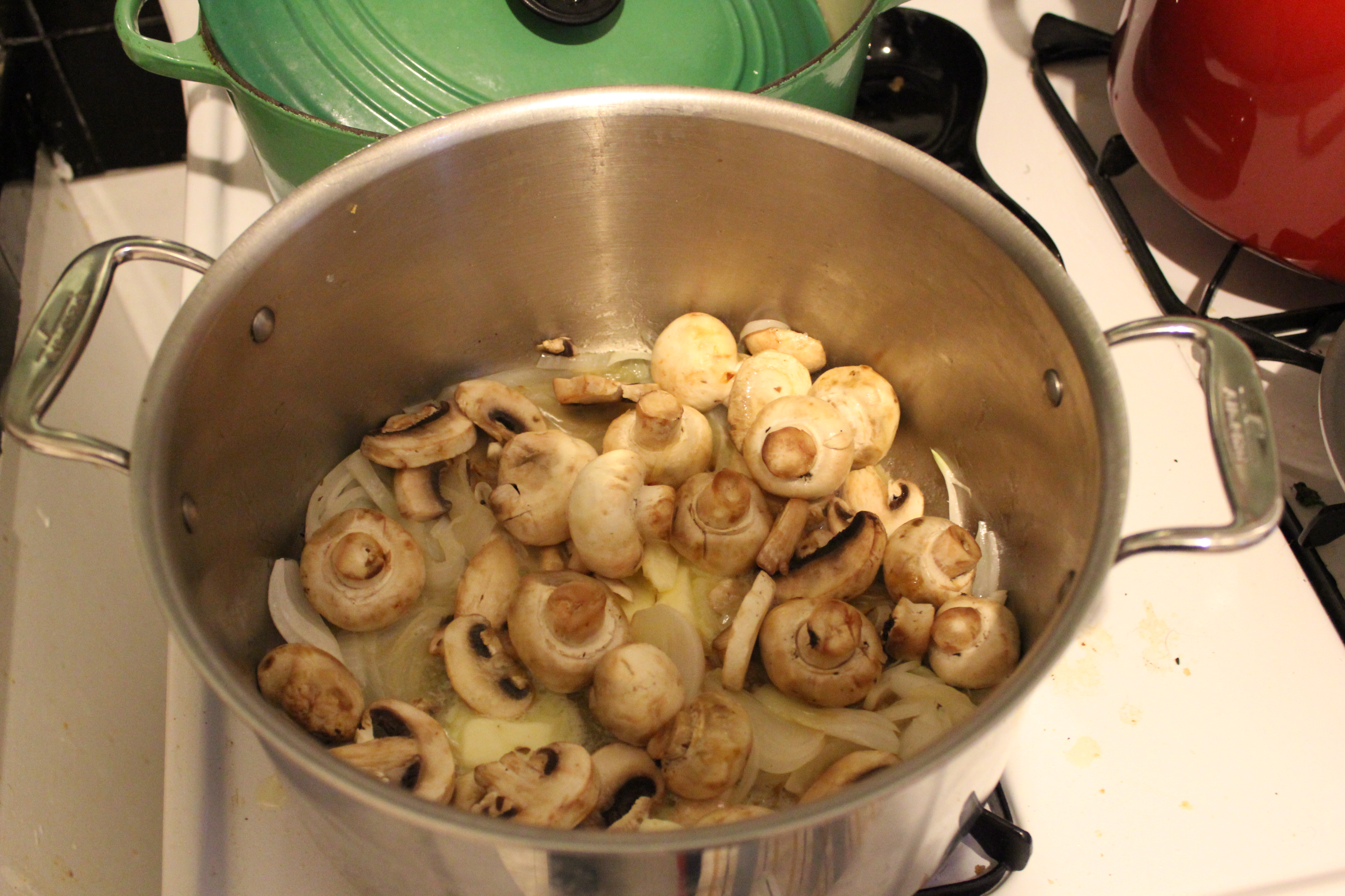 Per your directions, I sauteed onions in butter until the onions were translucent, and threw in the mushrooms. If these pictures look better than the ones I used previously, it’s because now I’ve got a really professional camera, instead of just relying on my iPhone, by the way.