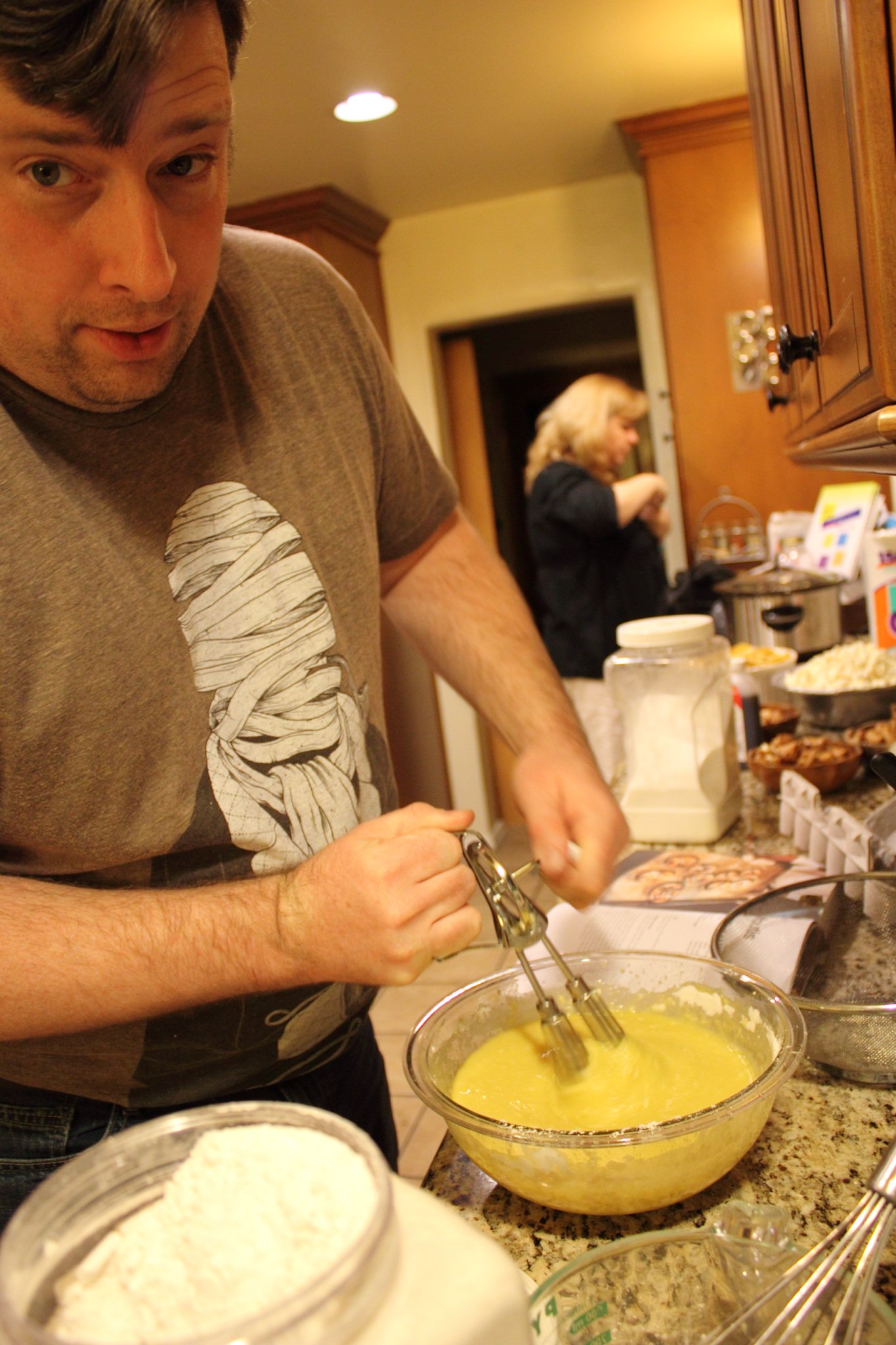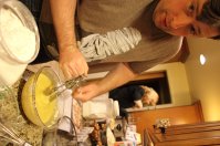 Next came egg-beating. It was only after using the old-fashioned egg-beater that the hostess told me she had a motorized one. Also, with these old-timey ones, for some reason I have to resist the impulse to chase MLF around with it, grinning lasciviously and twirling the blades.