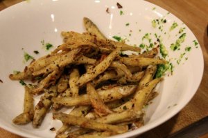 Some people liked ’em and some people wouldn’t touch them. I gave a few of them a try, but they weren’t quite perfectly crisp – they were a little chewy. And the chewiness sort of enhanced the fishy flavor, which wasn’t really the way to go. I’m not sure I’d make these again, Chef. Mostly because squeezing the guts out of the fishies was not only kinda gross, but really tedious. Maybe I needed hotter oil, maybe I needed to cook them a little longer, but these weren’t really like ethereal french fries.