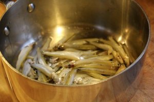 I’ve cleaned my fair share of fish. But something about squeezing the guts right out their butts is extra gross. Actually, most of these smelts were bigger than the ones you recommended, and already had a little hole in the ventral side. So even the gentlest squeeze results in all the innards boiling out of that hole, rather than the “whazoo” as you recommend, Chef. It’s pretty laborious, too, there’s no fast way to do it. So after about 45 minutes or so, I had a bowl full.