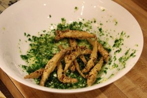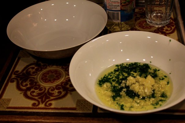 While they were frying, I threw together the garlic, parsley, and some olive oil. Once they were sort of golden brown and floating, I pulled them out with a slotted spoon, and tossed them in the garlic mix.