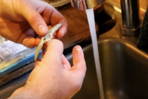 Ok, maybe I exaggerate a little. They were kind of hard to find, and despite your exhortation to get fresh and tiny smelts, I could only get previously-frozen smelts from the always wonderful Super King Market. When I brought them up to the checkout, the girls manning the register had a lot of questions, with that look in the eye that says, “You are a crazy white person.” (I get that look a lot.) Anyway, I brought them home and got to the gross part, squeezing their guts out.