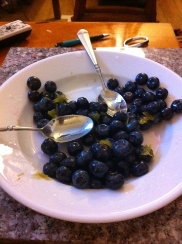 Simmer some lime zest in sugarwater, throw it on top of blueberries mixed with lime juice and sugar. A little mint, and the result: a light, sweet and tangy dessert.