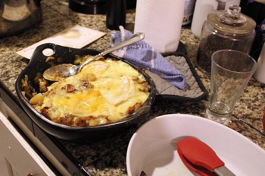 Scumbling up the potato, bacon and onions in the pan is easy. Then put in a layer in a casserole, and cover it with rebolochon cheese. Another layer of the mix, and another layer of cheese on top. Melt in oven. Bask in the glory that is one of the most comforting of comfort foods imaginable.
