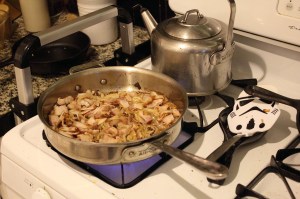 So they might just be lamb’s kidneys, but they really did the trick. I started out by browning the kidneys and setting them aside in a warming tray. That took too much attention to take a picture, so you’ll have to imagine some nicely browned kidneys. Then I continued as you always do with yer basic Frenchie meat dish; slice yer shallots, de-glaze the pan, brown the shallots.